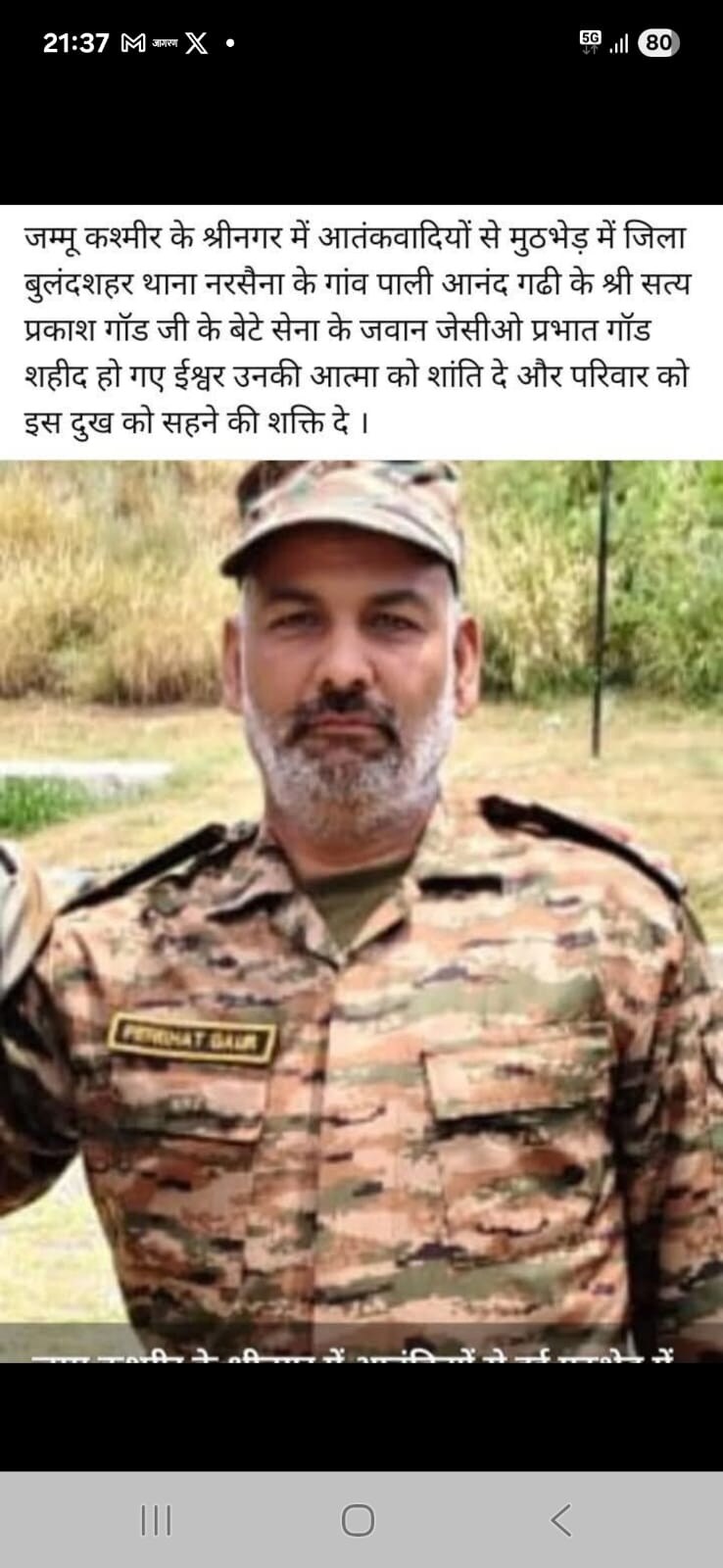 जम्मू-कश्मीर के श्रीनगर में आतंकियों से मुठभेड़ के दौरान बुलंदशहर के लाल प्रभात गौड़ शहीद हो गए. भारतीय सेना में जेसीओ के पद पर तैनात प्रभात की शहादत की खबर मिलते ही उनके पैतृक गांव नरसेना थाना क्षेत्र के पाली आनंदगढ़ी में मातम पसर गया. ग्रामीणों की आंखें नम हैं और गमगीन माहौल है. शहीद का पार्थिव शरीर आज गांव पहुंचेगा, जहां राजकीय सम्मान के साथ अंतिम संस्कार किया जाएगा.
