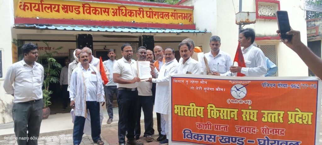 विकासखंड मुख्यालय पर मंगलवार को भारतीय किसान संघ उत्तर प्रदेश द्वारा किसान समस्याओं के संबंध में पांच सूत्री मांग पत्र खंड विकास अधिकारी नितिन कुमार को ज्ञापन दिया गया। ज्ञापन में कहा गया है कि खरीफ की प्रमुख फसल धान के लिए अब तक प्रचुर मात्रा में यूरिया एवं डीएपी उपलब्ध न होने के कारण किसानों की खेती प्रभावित हुई है।