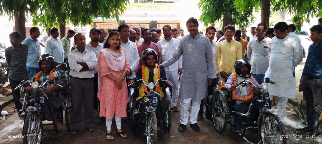 Sonbhadra। प्रधानमंत्री नरेन्द्र मोदी के जन्म दिवस के शुभ अवसर पर विकास खण्ड परिसर घोरावल में विधायक अनिल कुमार मौर्य के कर-कमलो से 10 मोटराईज्ड ट्राईसाईकिल व 03 जोड़ी बैसाखी का वितरण किया गया।