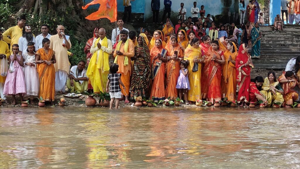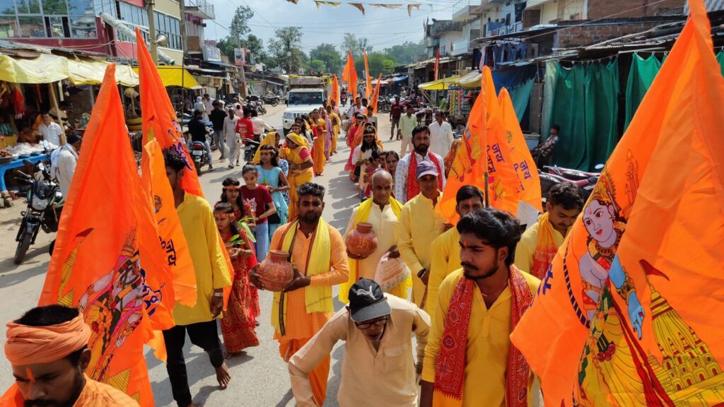 थाना क्षेत्र के अंतर्गत झारखंड बॉर्डर पर स्थित दिगंबर अखाड़ा अयोध्या से संबद्ध श्री राम जानकी मंदिर व बाबा डीहवार के प्रांगण से आज नवरात्रि के प्रथम दिन बाबा वेद मोहन दास ब्रह्मचारी जी के नेतृत्व में ध्वनि विस्तारक यंत्र पर जय माता दी जय माता दी प्रेम से बोलो जय माता दी के मधुर गीतों के साथ सैकड़ो की तादाद में महिला पुरुषों का काफिला कलश यात्रा लेकर निकला, कलश यात्रा मेन रोड से होते हुए हलवाई चौक, सुभाष तिराहा, मुडिसेमर तिराहा से चलकर मुडिसेमर ग्राम पंचायत में स्थित शिव मंदिर से सटे निरंतर बहने वाली सतत वाहिनी नदी के तट पर पंडित नंदलाल तिवारी के द्वारा वैदिक मंत्रों के साथ जल भर गया।