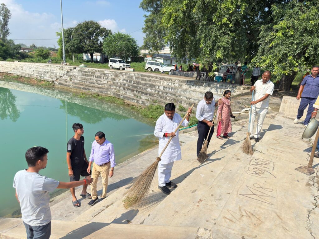एक दिन एक घंटा, एक साथ’ अभियान के तहत राज्य मंत्री के साथ भाजपा कार्यकर्ताओं व प्रशासनिक अधिकारीयों ने खुद झाड़ू लगाकर सफाई अभियान को आगे बढ़ाते हुए स्वच्छता का संदेश दिया।अमृत सरोवर तालाब की सीढ़ियों पर जमीं मिट्टी व चहुंओर फैले कूड़ा करकट की विधिवत साफ सफाई के बाद एकत्रित कूड़े को नष्ट कर दिया गया।
