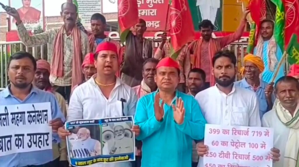 SONBHADRA । आज समाजवादी पार्टी कार्यकर्ताओं ने स्वर्ण जयंती चौक पर भाजपा सरकार की नीतियों का विरोध किया, जीएसटी उपहार को बताया छलावा, आठ साल लुट फिर छूट, भाजपा सरकार जनता को गुमराह कर रही है ।
