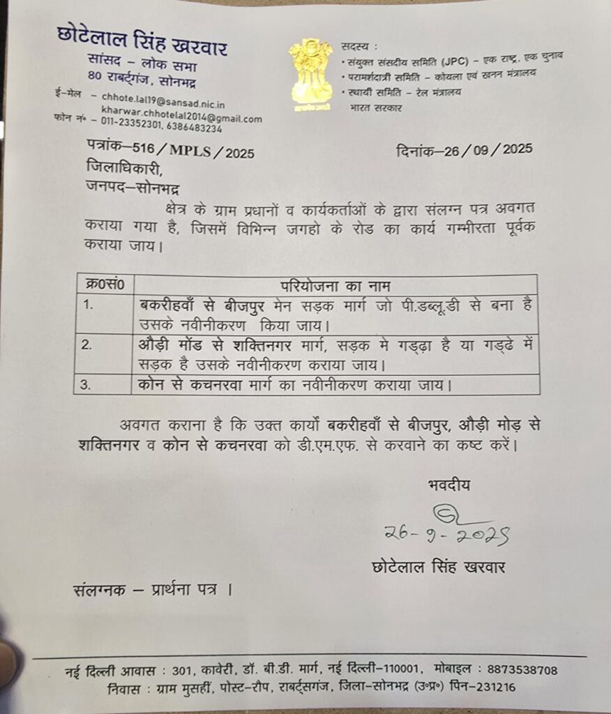 सांसद छोटे लाल खरवार ने जिलाधिकारी सोनभद्र को पत्रक सौंप बीजपर से बकरिहवा की सड़क बनवाए जाने के लिए दिया और कहा कि आए दिन इस सड़क पर दुर्घटनाएं हो रही है और आना जाना मुश्किल हो गया है बड़े गढ्ढों में बरसात का पानी भरा हुआ है।जिलाधिकारी ने समस्या का समाधान करवाए जाने का आश्वासन दिया है।वर्षों से खराब हुई सड़क को लेकर आम आवाम परेशान हैं।