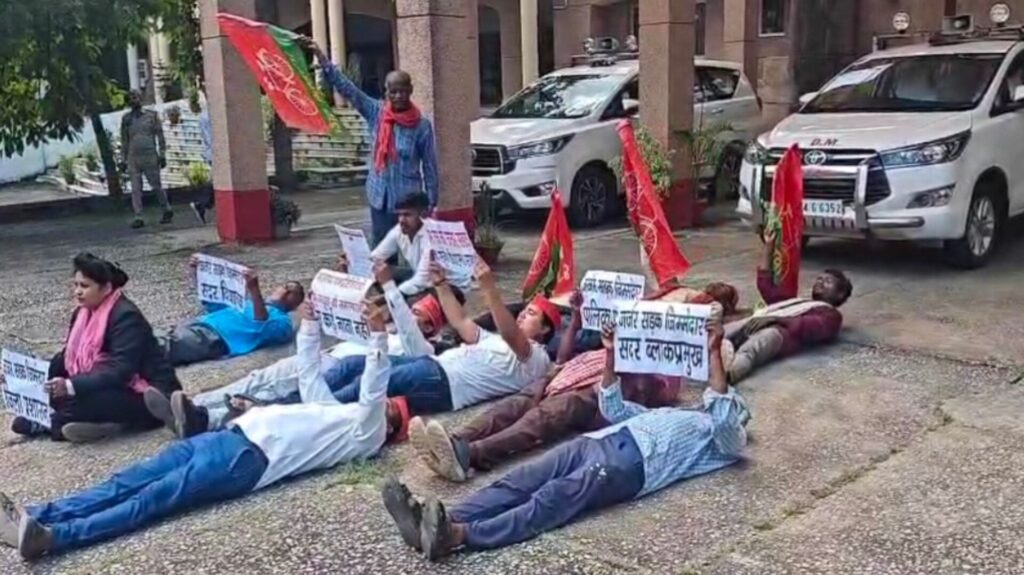 SONBHADRA । समाजवादी पार्टी कार्यकर्ताओं ने जिलाधिकारी कार्यालय पर, सर्विस लेन सड़क की दुर्व्यवस्था को लेकर प्रदर्शन किया और ज्ञापन सौंपा, ज्ञापन के माध्यम से सपा जिला सचिव प्रमोद यादव ने कहा कि सोनभद्र में जर्जर सड़कों से लोग घायल हो रहे हैं, स्कूल जाते समय बच्चे सायकिल से गिर रहे हैं।