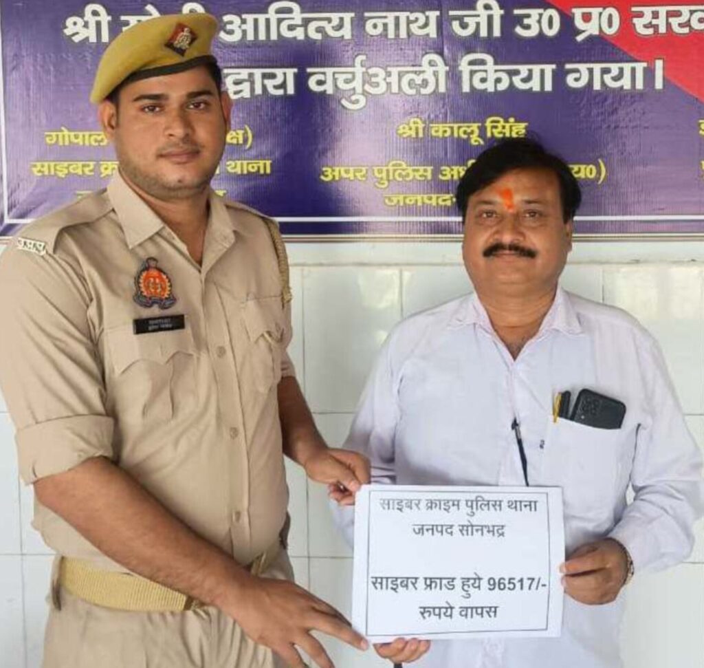 SONBHADRA । थाना साइबर टीम के द्वारा आवेदक रवि कुमार चौरसिया पुत्र शंकर प्रसाद चौरसिया निवासी दर्जी रोड मेन मार्केट थाना पिपरी जनपद सोनभद्र के साथ किसी अज्ञात व्यक्ति द्वारा फ्राड कर के धनराशि को ट्रांसफर करा लिया गया था। जिसके क्रम में त्वरित कार्यवाही करते हुये बैंक से पत्राचार कर फ्राड हुई धनराशि को होल्ड कराया गया, एवं न्यायालय से धनराशि वापसी का आदेश प्राप्त कर सम्बन्धित बैंक से पत्राचार के क्रम में फ्राड हुई धनराशि में से 96517/- रुपये को आवेदक के मूल खाते में सफलतापुर्वक वापस कराया गया।