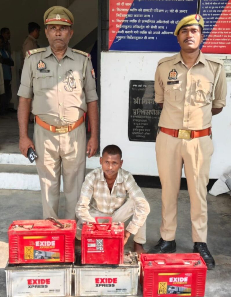 थाना चोपन पुलिस द्वारा थाना स्थानीय पर पंजीकृत मु0अ0स0-381/2025 धारा 303(2), 317(2), 317(5) बीएनएस सम्बन्धित एक अभियुक्त को पालीटेक्निक कॉलेज जाने वाले तिराहे, थाना चोपन सोनभद्र से गिरफ्तार कर कब्जे से चोरी की 05 अदद एक्साइड कम्पनी की बैटरी बरामद किया गया।