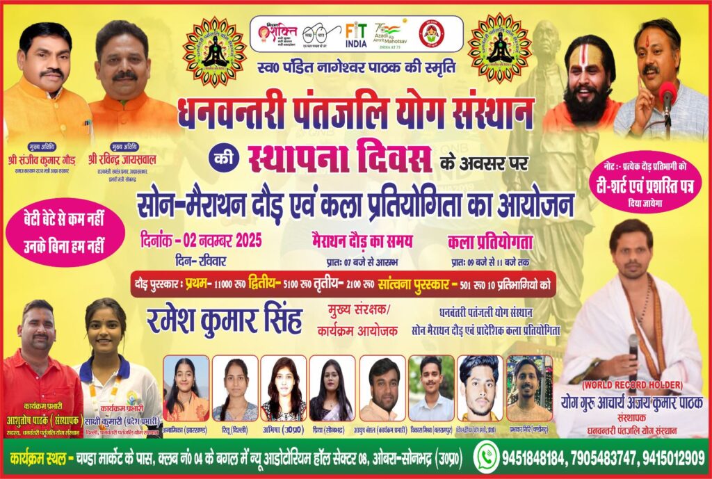 SONBHADRA । ओबरा में ‘बेटी बेटे से कम नहीं, उनके बिना हम नहीं’ के बुलंद नारे के साथ, धनवन्तरी पतंजलि योग संस्थान इस बार अपना स्थापना दिवस बेहद खास और रोमांचक अंदाज में मनाने जा रहा है। सोनभद्र के ओबरा में, दिनांक 02 नवंबर 2025, दिन रविवार को पण्डित स्व.नागेश्वर पाठक स्मृति एवं ‘धनवन्तरी पतंजलि योग संस्थान’ की वर्षगाँठ & स्थापना दिवस के अवसर पर ‘सोन-मैराथन दौड़’ और एक भव्य ‘प्रादेशिक कला प्रतियोगिता’ का संयुक्त आयोजन किया जा रहा है।