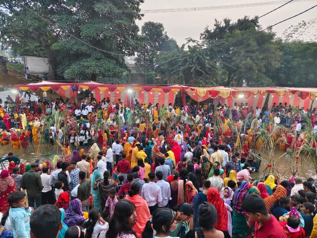 इस अवसर पर वातावरण में गूँजते छठ माई के भजनों ने वातावरण को भक्तिमय बना दिया।एकलव्य छठ घाट पर समारोह में आए प्रयागराज व वृंदावन की झांकिया ने एक से बढ़कर एक राधा कृष्ण काली माई की झांकिया ने श्रद्धालुओं के मन को मोहा लोक गायकों ने छठ माई की महिमा का गुणगान किया कांचही बांस की बहंगिया, बहंगी लचकत जाय,काठ के रे नइया दर्शन देखाई दिही कई भजन गाए दउरा में फल लोटे में जल शाम को प्राकृतिक नदी 21 नंबर पुल तट पर असंख्या दिप जगमगा रहे थे।