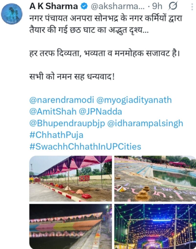 जो साफतौर पर नगर कर्मियों ने साबित कर दिखाया कि ये ‘नए भारत के नए उत्तर प्रदेश के नया नगर हैं।नगर में सजाएं गए छठ घाटों की भव्यता और सौंदर्य ने सभी का मन मोह लिया।नगर विकास मंत्री श्री ए.के.शर्मा ने नपं पंचायत के इन अद्भुत,अलौकिक एवं उत्कृष्ट छठ घाटों की मनोहारी झलक को अपने एक्स पर साझा किया।मंत्री जी द्वारा अनपरा नगर पंचायत की सराहना करते हुए किए गए इस पोस्ट से नगरकर्मियों में अपार हर्ष और गर्व की अनुभूति हो रही है।पूरे नगर में खुशी की लहर व्याप्त है।