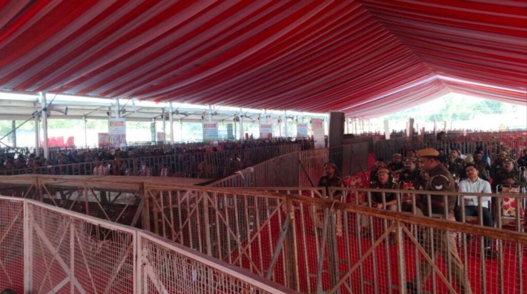 मण्डलायुक्त व आई0जी0 ने जन सभा स्थल पर पहुंचकर बनाये जा रहे मंच का स्थलीय निरीक्षण किये, तैयार किये जा रहे मंच के मजबूती और अन्य आवश्यक प्रबंध के निर्देश सम्बन्धित को दिए। इसी प्रकार से मण्डलायुक्त ने जनसभा स्थल परीसर में लगाये जा रहे टेन्ट व्यवस्था, बैरिकेटिंग, जनसभा में जनता के आवागमन के दृष्टिगत आने-जाने हेतु निकासी व्यवस्था, वी0आई0पी0 व मीडिया बन्धुओं को कवरेज हेतु तैयार किये जा रहे मंच व स्थल का जायजा लिये।
