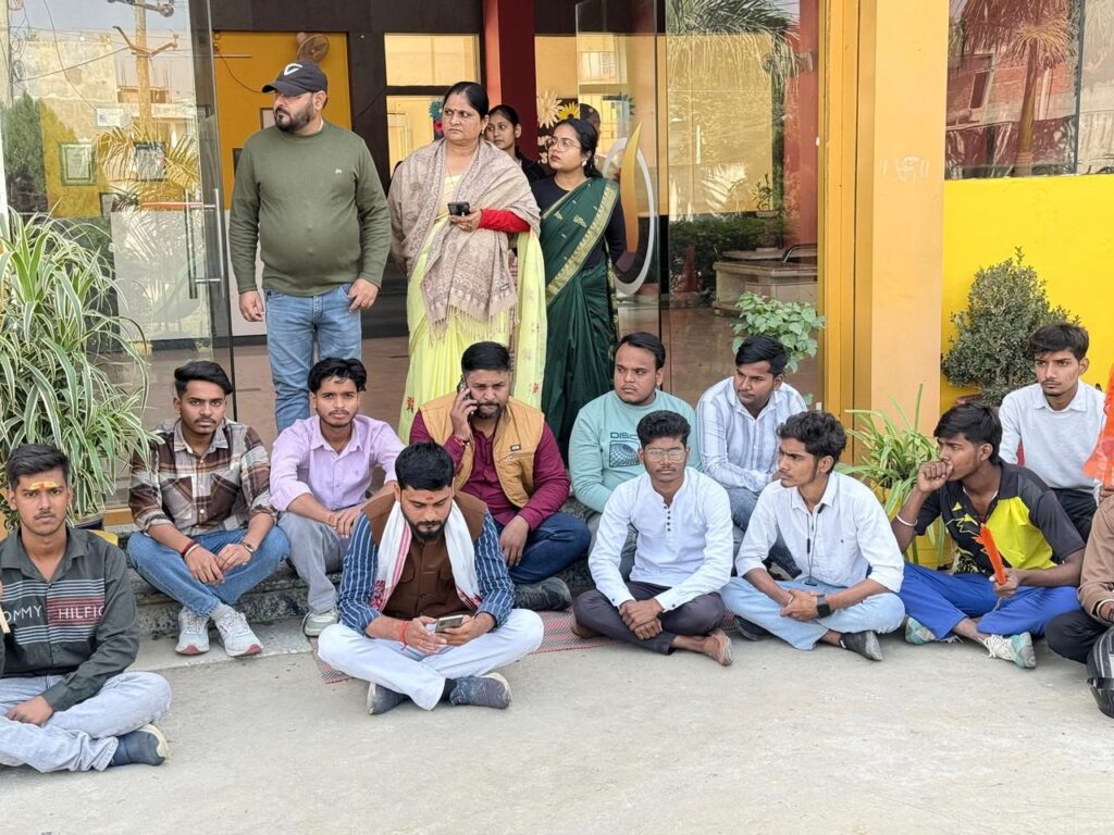 SONBHADRA । अखिल भारतीय विद्यार्थी परिषद जिला के कार्यकर्ताओं द्वारा रॉबर्टसगंज नगर के जयपुरिया स्कूल में प्रधानाचार्य के द्वारा कक्षा 12 वीं के छात्र की बर्बरता पूर्वक पिटाई किए जाने एवं विद्यालय से निष्कासित किए जाने के विरोध में विद्यालय के प्रधानाचार्य का प्रतीकात्मक पुतला फूंक कर विरोध प्रदर्शन किया गया।