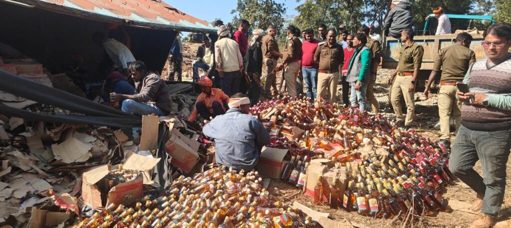 __तीस लाख रुपए कीमत से ज्यादा की सैकड़ों पेटी अंग्रेजी शराब की बोतलें फैल गईं