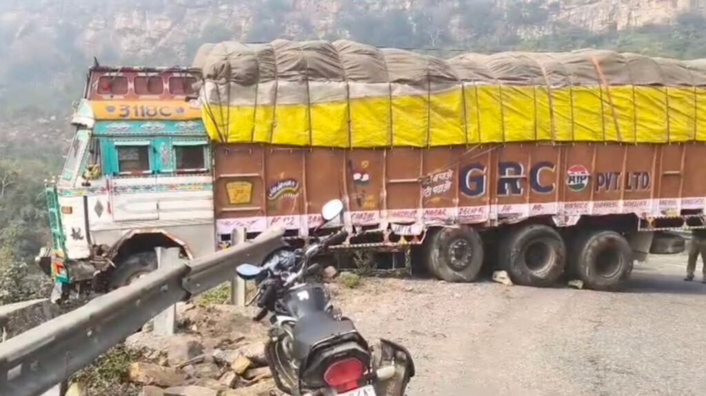 चोपन थाना क्षेत्र के अन्तर्गत मारकुंडी पुरानी घाटी में मंगलवार दोपहर 12 बजे के लगभग किराना का सामान लोड ट्रक नीचे उतर रही थी कि तीसरे मोड़ पर अनियंत्रित होकर पहाड़ पर रेलिंग तोड़ते हुए आधा हवा में लटक गई, आगे सैकड़ों फिट नीचे खाई देखकर चालक की सांसे थम गई, घटना में जिसमें चालक सुमित उम्र 38 वर्ष निवासी इटावा को हल्की चोटो के साथ सुरक्षित बच गया।