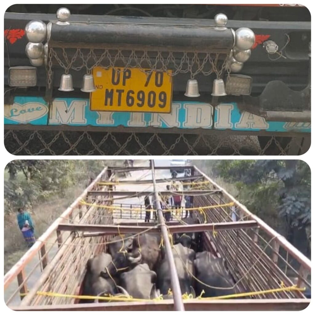 बसंतपुर थाने के टी आई जितेंद्र सोनी ने बताया कि पशु तस्करों का सूचना जरिए मुखबिर मिली कि एक डी सी एम वाहन पर भैंस लेकर यूं पी रास्ते ले जाया जा रहा हैं तत्काल थाने की भ्रमणशील पुलिस पशु लदे वाहन का पीछा किया जो यूं पी के रास्ते महुअरिया से बीजपुर के थाना क्षेत्र में भागने लगे अपने को पकड़े जाने से घिरता देख पिपरहर मोड़ पर गाड़ी खड़ा कर चालक फरार हो गया।