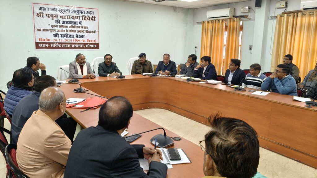 Sonbhadra । राज्य सूचना आयुक्त उत्तर प्रदेश पदुम नारायण द्विवेदी की अध्यक्षता में आज सर्किट हाउस चुर्क में सूचना अधिकार अधिनियम के तहत सूचना आयोग उत्तर प्रदेश में लम्बित अपीलों/शिकायतों की समीक्षा बैठक किये।