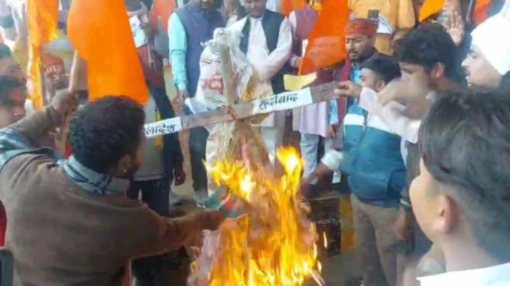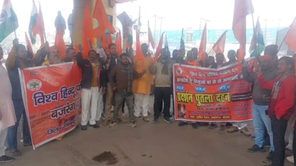 Sonbhadra । बांग्लादेश में हिंदू समुदाय के खिलाफ लगातार हो रही हिंसा और हिंदू युवक दीपू दास की निर्मम हत्या के विरोध में देशभर में आक्रोश फैल गया है। इसी कड़ी में बुधवार को रॉबर्ट्सगंज में नरसिंह त्रिपाठी के नेतृत्व में हिंदू संगठनों ने जोरदार प्रदर्शन किया। बजरंग दल और विश्व हिंदू परिषद के नेतृत्व में सैकड़ों की संख्या में लोग सड़कों पर उतरे और बांग्लादेश का परिकात्मक पुतला दहन किया और “युसूफ खान मुर्दाबाद”, “बांग्लादेश मुर्दाबाद” जैसे नारे लगाए।