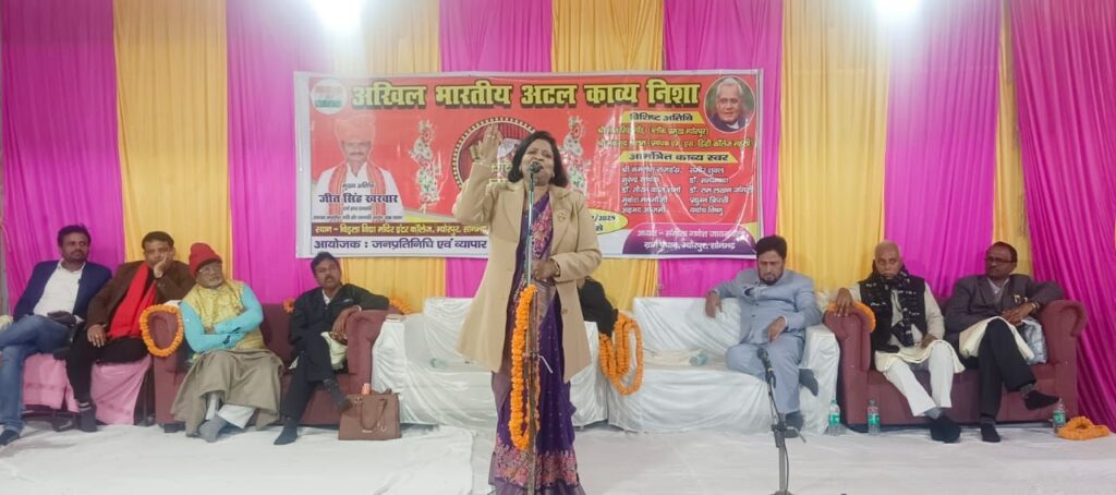 नागपुर से आए मुकेश मनमौजी ने देश को खोखला करने वालों पर गहरी चोट करते हुए ये पंक्तियां प्रस्तुत की.. इधर से टूटा है,उधर से फूटा है ।ये हिंदुस्तान है इसे भ्रष्ट नेताओं ने लुटा है। फतेपुर से पधारे हास्य कवि समीर शुक्ल ने .मन की मैल मिटे न पावे, पुजी लियब पंडी पंडा, प्रस्तुत की, गोरख पुर की कवित्री डॉ सत्यमवंदा ने प्रेम रस का गीत प्रस्तुत करते हुए.. तेरे जीवन में पहले सी रवानी हो नहीं सकती, मेरी जैसी कोई तेरी दीवानी हो नहीं सकती।