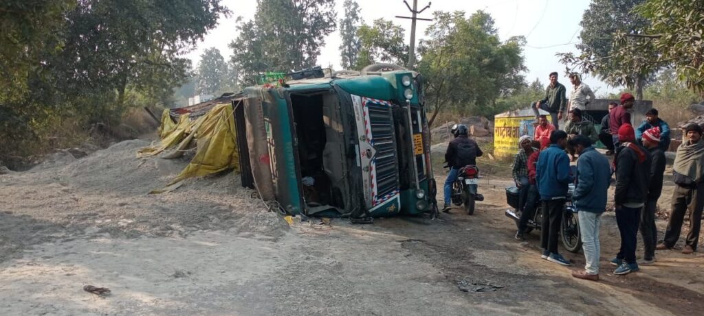 जानकारी के अनुसार एनटीपीसी रिहंद नगर के राख बंधे से राख लोड कर बुधवार की शाम एक हाइवा अम्बिकापुर छत्तीसगढ़ जा रहा था अचानक जरहा गांव के पास बीजपुर रेणुकूट मुख्य मार्ग के बीचों बीच वो अनियंत्रित होकर पलट गया।हाइवा के पलटते ही राहगीरों सहित ग्रामीणों ने दौड़कर कैबिन से चालक को सुरक्षित बचा लिया बाहर निकलते ही चालक अंधेरे का फायदा उठा कर मौके से फरार हो गया।