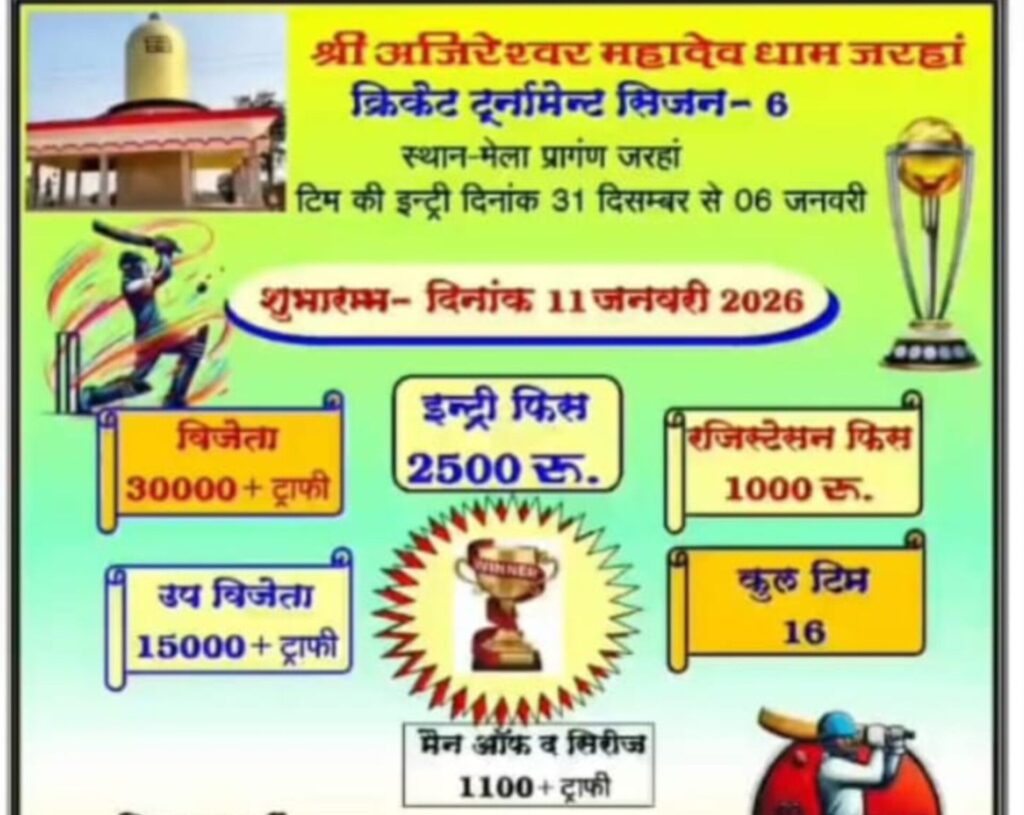 न्याय पंचायत जरहा के अजीरेश्वर महादेव मंदिर प्रांगण के खेल मैदान में अंतर्राज्यीय क्रिकेट प्रतियोगिता का महाकुंभ ग्यारह जनवरी से लगेगा जिसमें कुल सोलह टीमें भाग लेगी।क्रिकेट टीम का पंजीकरण एकतीस दिसंबर से छ जनवरी 2026 तक होगा।यह क्रिकेट प्रतियोगिता विगत कई वर्षों से होता आ रहा है जो बहुत ही रोमांचक होता हैं।इस बात की जानकारी अजीरेश्वर धाम परमार्थ जन सेवा ट्रस्ट एवं सांस्कृतिक समिति द्वारा दी गई।