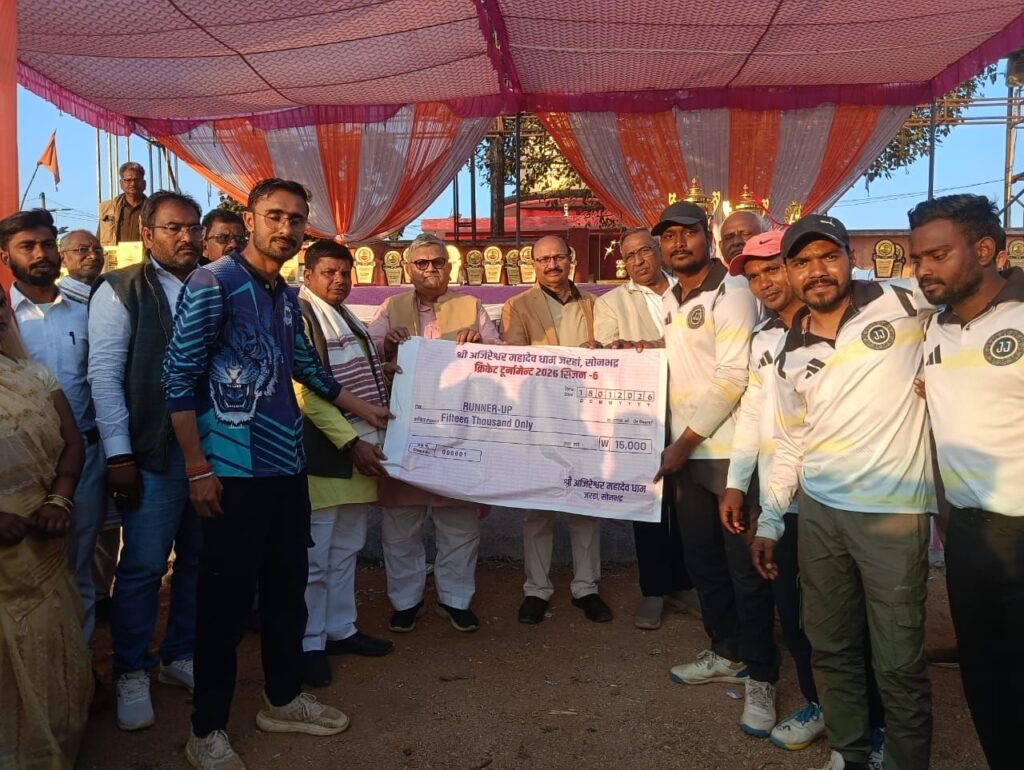 एस सी सी सिंगरौली वर्सेस वाड्रफनगर के बीच खेला गया।खेल का शुभारंभ आचार्य एन के दुबे ने मुख्य अतिथि श्याम नारायण पाण्डेय,विशिष्ट अतिथि ग्राम प्रधान जरहा सुशील देवी एवं प्रतिनिधि बिनोद भारती से विकेट का पूजा अर्चना कराकर किया। अतिथियों का आयोजकों ने माल्यार्पण व अंग वस्त्र प्रदान कर सम्मानित किया।