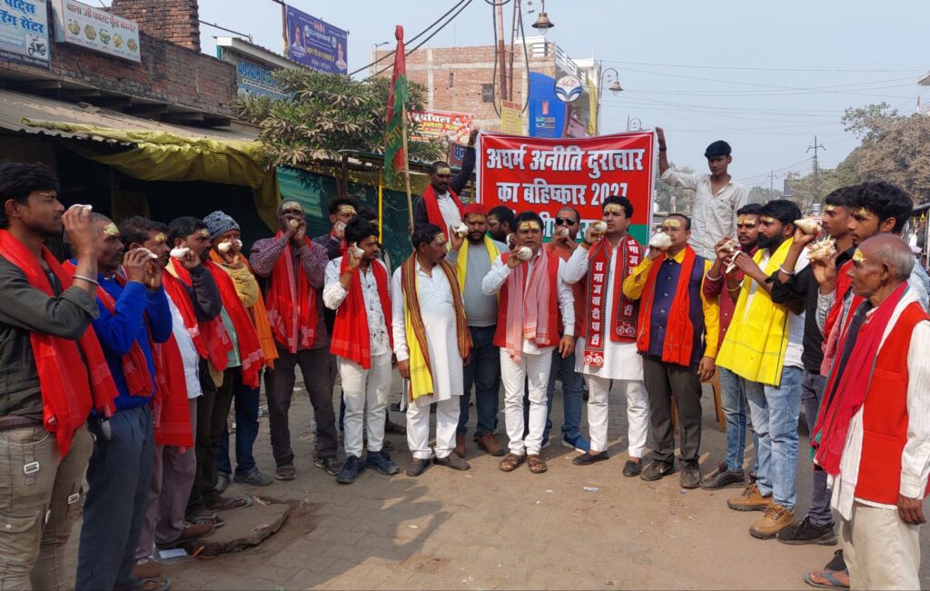 — बढ़ौली चौराहे पर 27 शंख बजाकर मंहगाई बेरोज़गारी को लेकर प्रदर्शन किया