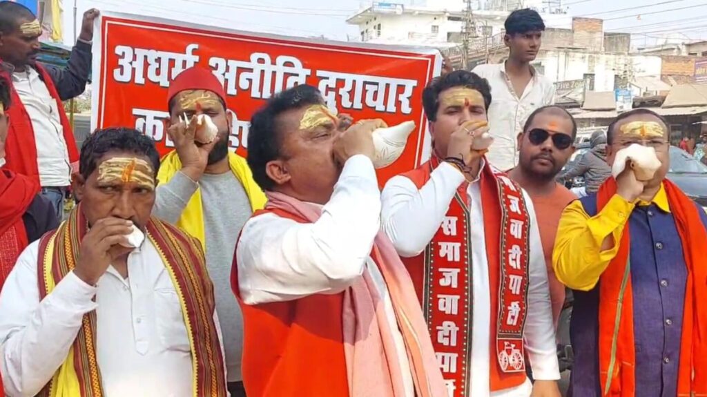 Sonbhadra । जनपद में सपा कार्यकर्ताओं ने एक अनोखा प्रदर्शन किया, आने वाले 2027 विधानसभा चुनाव के लिए सपा कार्यकर्ताओं ने न सिर्फ शंखनाद किया बल्कि माथे पर ब्राह्मणों का टीका लगा लगाकर भाजपा सरकार को भगाने का संकल्प भी लिया,सपा नेता ने कहा कि सरकार महंगाई बेरोजगारी के मामले पर फेल थी और अब ब्राह्मण और संतों को भी पीट रही है, आपस में लड़ाने का काम कर रही है जिसे कत्तई बर्दाश्त नहीं किया जाएगा, आने वाले विधानसभा चुनाव में भाजपा की विदाई तय है।