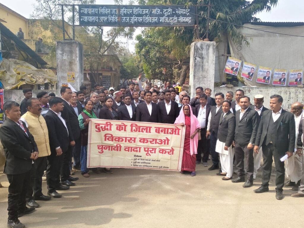 सिविल बार अध्यक्ष प्रभु सिंह कुशवाहा, विष्णुकांत तिवारी, रामजी पांडेय, सन्नो बानो सहित अन्य वक्ताओं ने कहा कि जिला बनाओ की आवाज दो दशक से ज्यादा दिनों से उठाई जा रही है। हमारी मांग है कि चुनावी सभा मे कहा जाता है कि सभी मानकों को पूरा करने वाले दुद्धी को सरकार द्वारा जिला बनाई जाएगी। लेकिन सरकार बनने के बाद अभी तक कोई भी निर्णय नही लिया जा रहा है।
