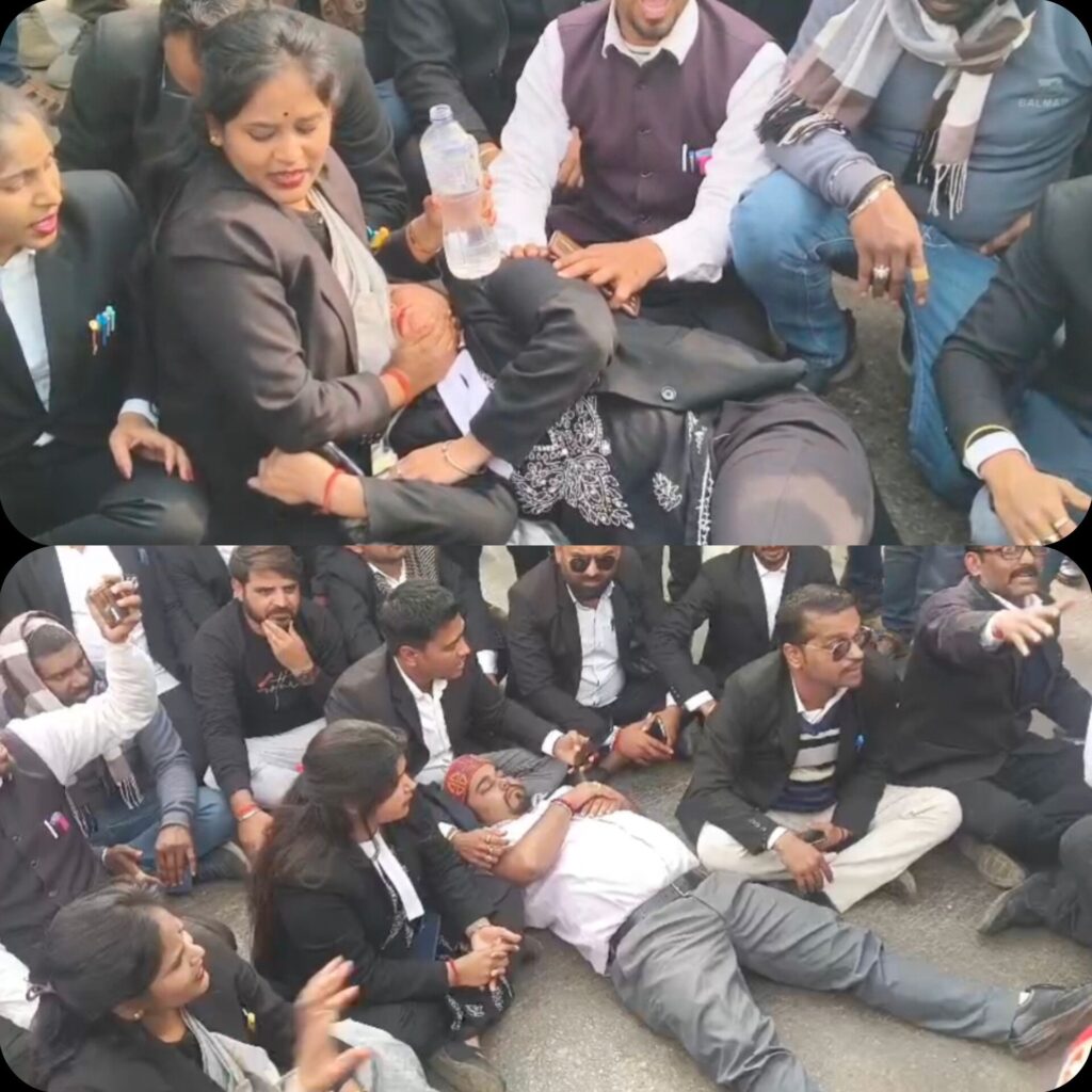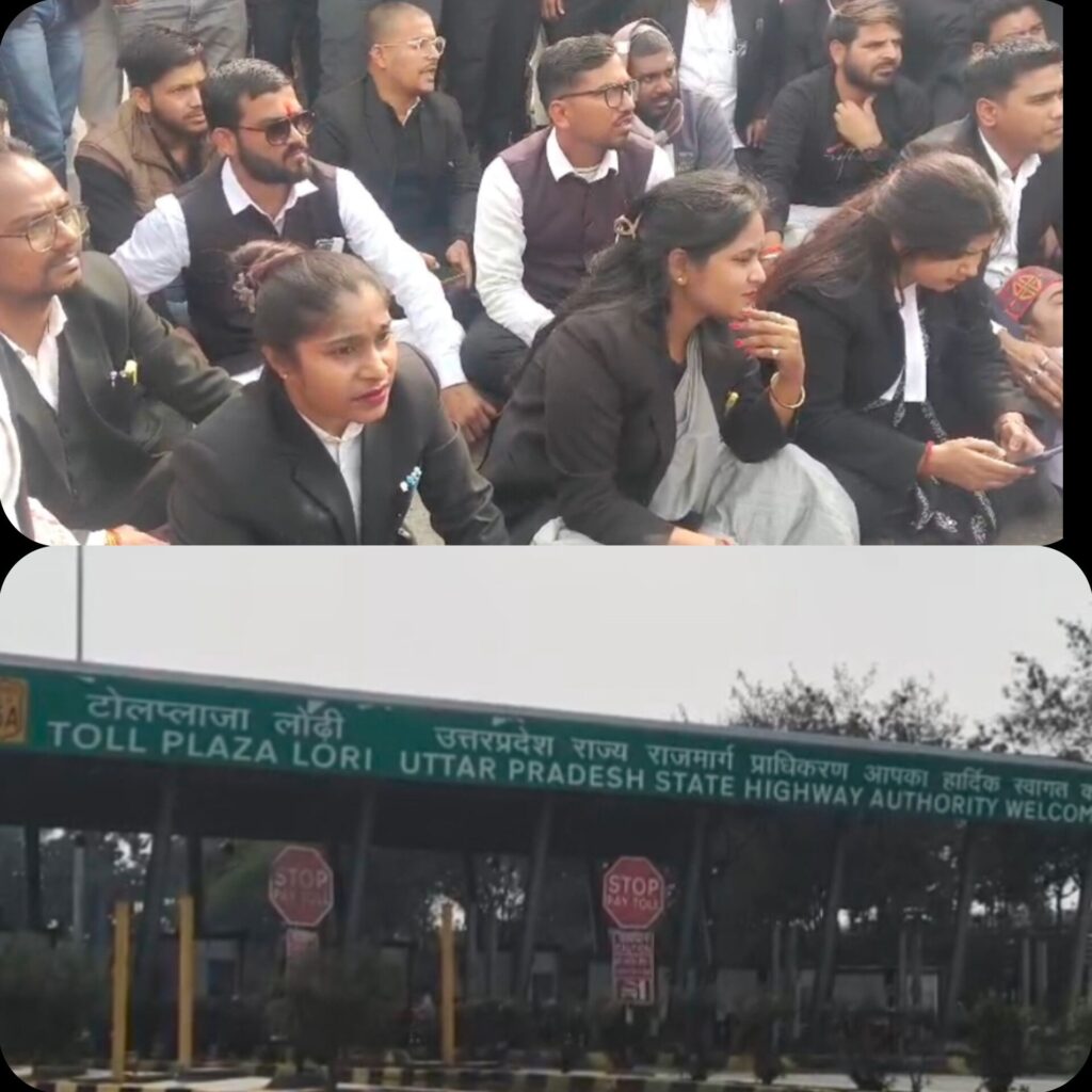 अधिवक्ताओं का हुजूम स्टेट हाईवे पर स्थित लोढ़ी टोल प्लाजा पहुंच गए और टोल पर ही सड़क पर बड़ी संख्या में धरने पर बैठ गए, इस दौरान टोल पर किसी अप्रिय घटना से निपटने के लिए कई थानों की पुलिस, पीएससी लगाई गई थी।
