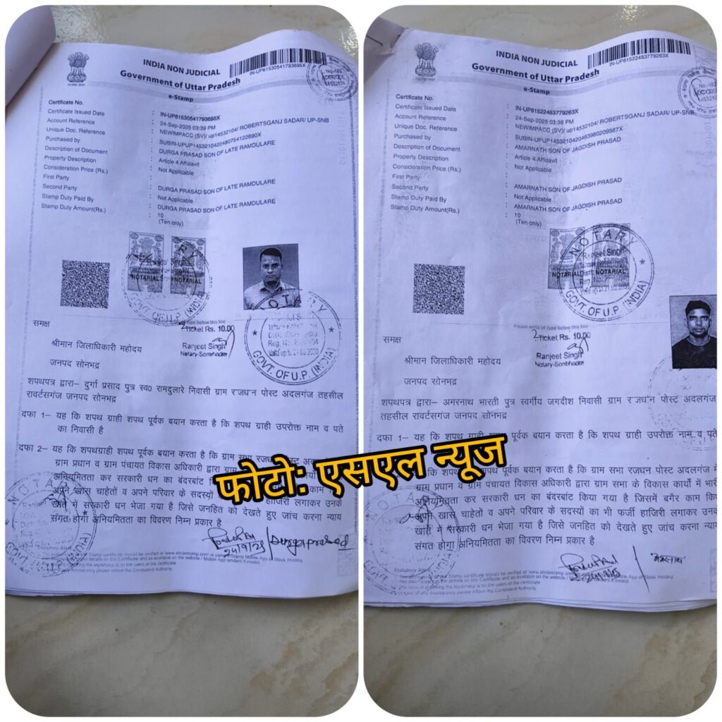 मुख्यमंत्री योगी आदित्यनाथ जीरो टॉलरेंस का दावा करते हैं, भ्रष्टाचार पर लगातार कार्रवाई भी की जा रही है लेकिन सोनभद्र में अधिकारी यूपी सरकार के आदेश को ठेंगा दिखाते नजर आ रहे है, मामला रॉबर्ट्सगंज ब्लाक के रजधन ग्राम पंचायत का बताया जा रहा है, जहां ग्राम पंचायत सदस्य अमरनाथ, सदस्य प्रतिनिधि दुर्गा प्रसाद और एक अन्य ग्रामीण ने बीते 14 सितंबर 2025 को स्टाम्प पेपर पर शपथ पत्र के साथ डीएम बद्रीनाथ सिंह से मिलकर गांव में विकाश के नाम पर हो रहे भ्रष्टाचार की जांच कर कार्रवाई की मांग की है।