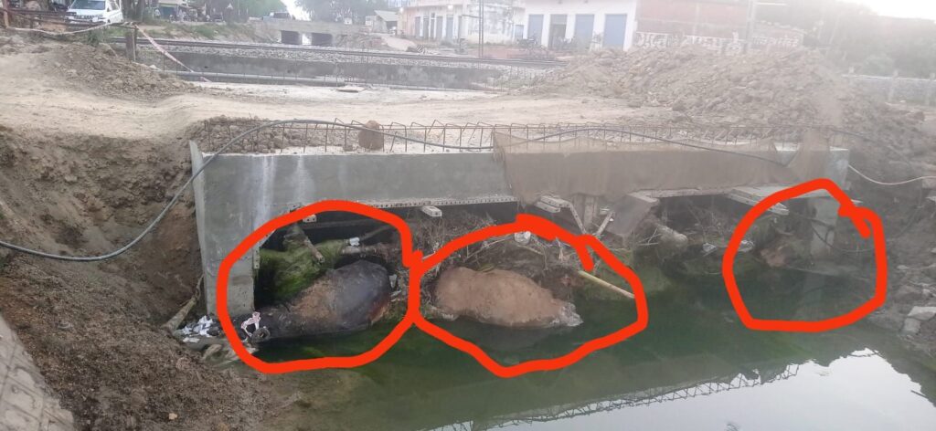 मरे हुए मवेशियों से उठ रही दुर्गन्ध से मुहल्ले वालों का जीना दुश्वार हो गया है। दुर्गन्ध से पूरा वातावरण दूषित हो गया। जिससे बीमारियों का भी खतरा बराबर बना हुआ है। कार्यदाई संस्था अगर शटरिंग के लिए लगे पाइप हटा ले तो मवेशी नहर के पानी बहकर अन्यत्र चले जायेंगे।