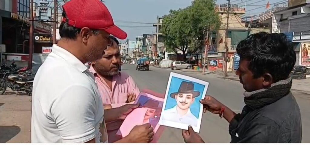 बहुत से लोग शहीदों को नही पहचान पा रहे थे।साथ मे पूर्व सभासद मिथलेश अग्रहरी जी उपस्थित रहें। खिलाड़ियों के बीच भगतसिंह कि तस्वीर वितरित किया गया। दिन भर जागरूकता कार्यक्रम जगह जगह चला।आज राष्ट्र नायक शहीद भगत सिंह जी का शहादत दिवस है मात्र 23साल 6माह के अल्प काल आयु में भारत को आजाद कराने के लिए अपने साथियों शहीद राजगुरु सुखदेव के साथ हंसते हंसते फांसी पर चढ़ गए।