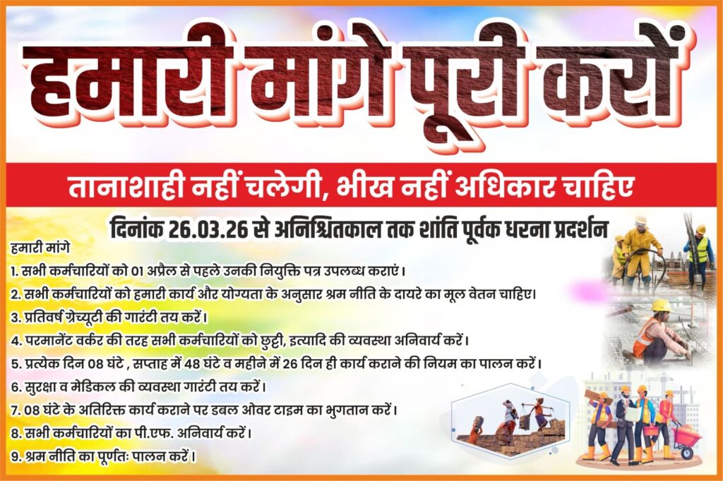 हस्ताक्षरयुक्त सैकडो श्रमिकों ने भेजे पत्र के माध्यम से अवगत कराया है कि सभी श्रमिकों को एक अप्रैल से पहले नियुक्ति पत्र उपलब्ध कराया जाय,योग्यतानुसार श्रम नीति के तहत मूल वेतन,26दिन की ड्यूटी,सुरक्षा और मेडिकल,आठ घंटे के अतिरिक्त ड्यूटी करने का डबल ओभर टाइम,पी,एफ सहित श्रम नीति का पूर्णतया पालन कराया जाय नहीं तो श्रमिक इस शोषण के विरुद्ध 26मार्च से अनिश्चित कालीन धरना प्रदर्शन जी भी पी आर कंपनी के विरुद्ध करने का निर्णय लिया है।