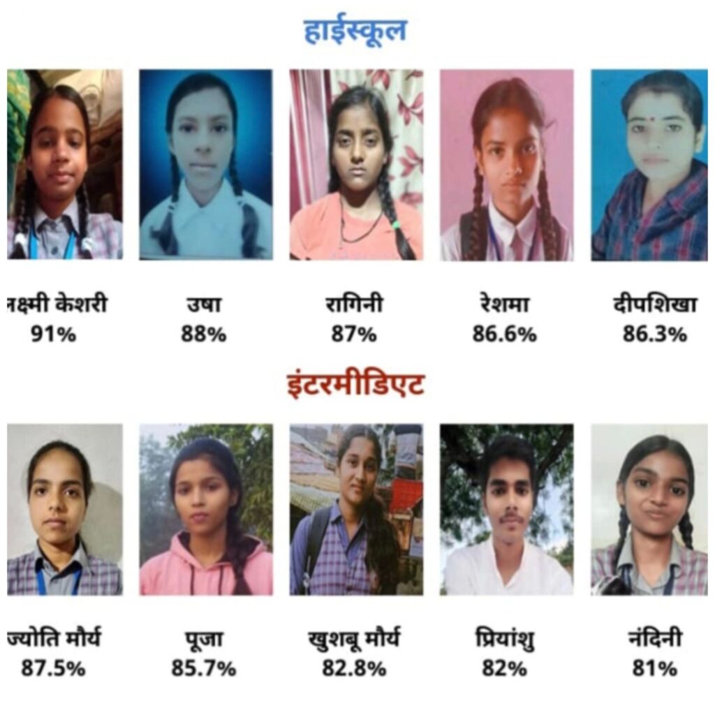 हाई स्कूल परीक्षा में लक्ष्मी केसरी ने 91% अंक प्राप्त कर विद्यालय का नाम रोशन किया। इसके अलावा उषा ने 88%, रागिनी ने 87%, रेशमा ने 86.6% तथा दीपशिखा ने 86.3% अंक प्राप्त किए। इंटरमीडिएट परीक्षा में ज्योति मौर्य ने 87.7%, पूजा ने 85.7%, खुशबू मौर्य ने 82.8%, प्रियांशु ने 82%, नंदिनी ने 81% तथा सत्यम ने 80.6% अंक प्राप्त कर उत्कृष्ट प्रदर्शन किया।