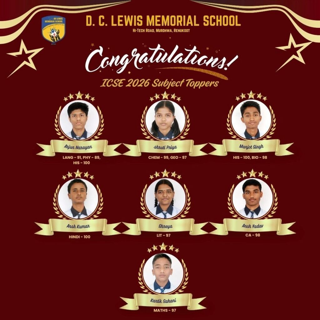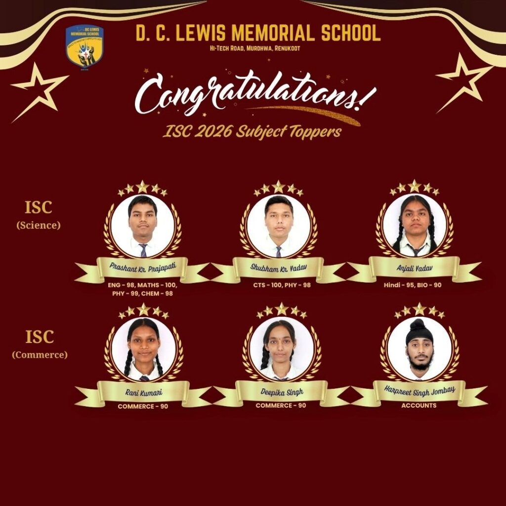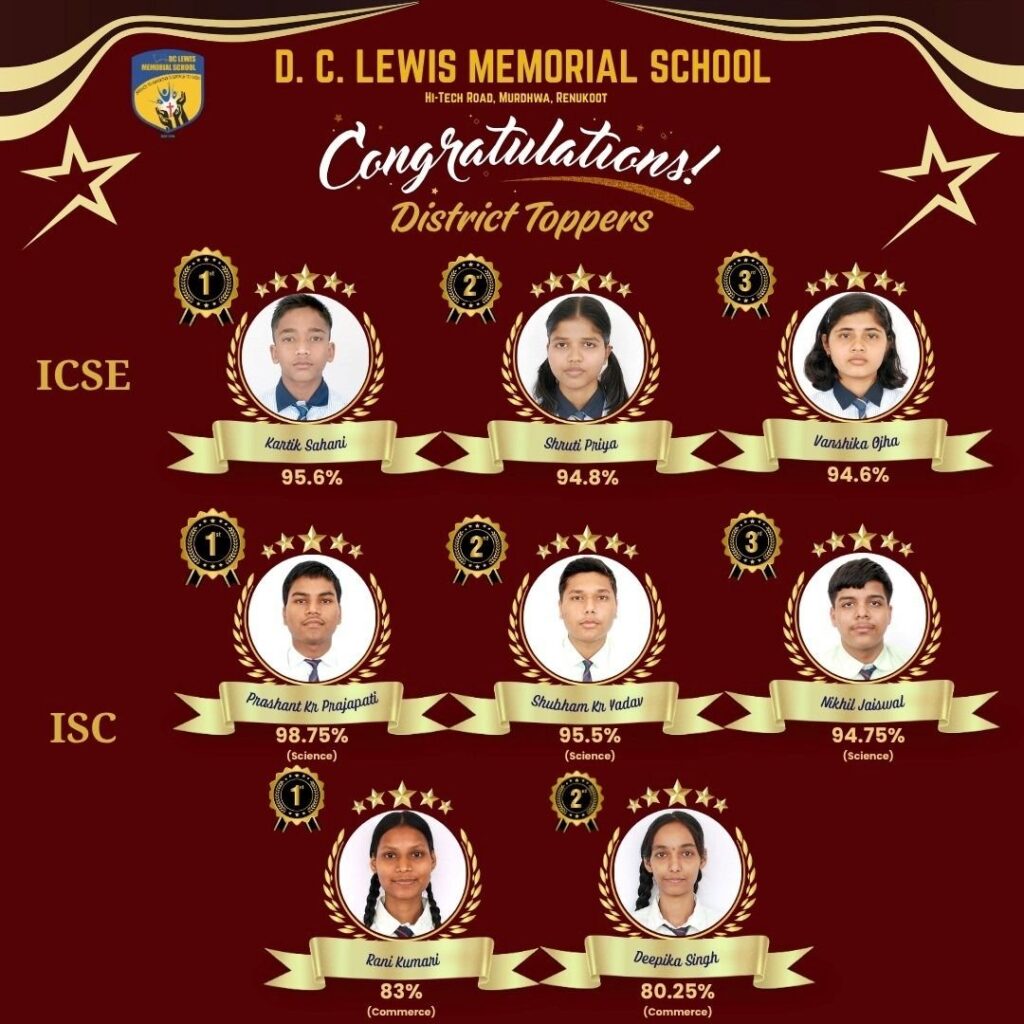 गुरुवार को घोषित आईसीएसई बोर्ड परीक्षा परिणाम में नगर स्थित डीसी लेविस मेमोरियल स्कूल का प्रदर्शन अत्यंत उत्कृष्ट रहा। विद्यालय के सेक्रेटरी जय सिंह डेविड ने जानकारी देते हुए बताया कि इस वर्ष कक्षा 10वीं में कुल 109 छात्र-छात्राएं परीक्षा में शामिल हुए थे, जिनमें से 105 विद्यार्थियों ने सफलता प्राप्त की। वहीं कक्षा 12वीं में 102 परीक्षार्थियों में से 100 छात्रों ने सफलता हासिल कर विद्यालय का नाम रोशन किया। कक्षा 12वीं के परिणाम में प्रशांत प्रजापति ने 98.75 प्रतिशत अंक प्राप्त कर प्रथम स्थान हासिल किया। शुभम यादव 95.5 प्रतिशत अंकों के साथ दूसरे तथा निखिल जायसवाल 94.75 प्रतिशत अंक प्राप्त कर तीसरे स्थान पर रहे।